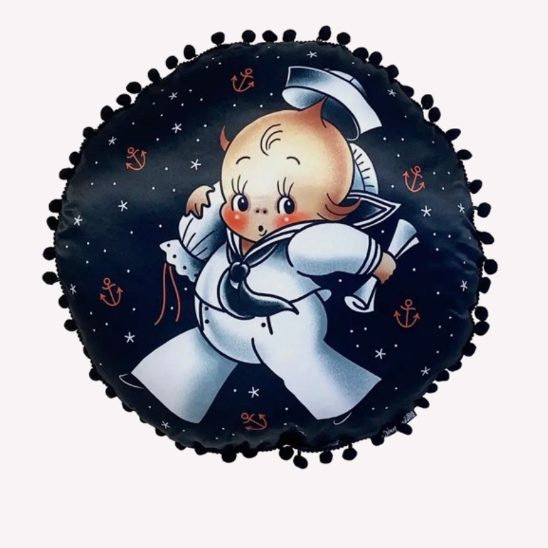 Här har vi en rund kudde med konstverk gjort av Stacey Martin Smith. Denna kudde är supermjuk och mysig och livar upp i din soffa, säng eller kanske i en mysig fåtölj i ditt uterum. Kudden består av mjuk satin med en festlig pom pom trim